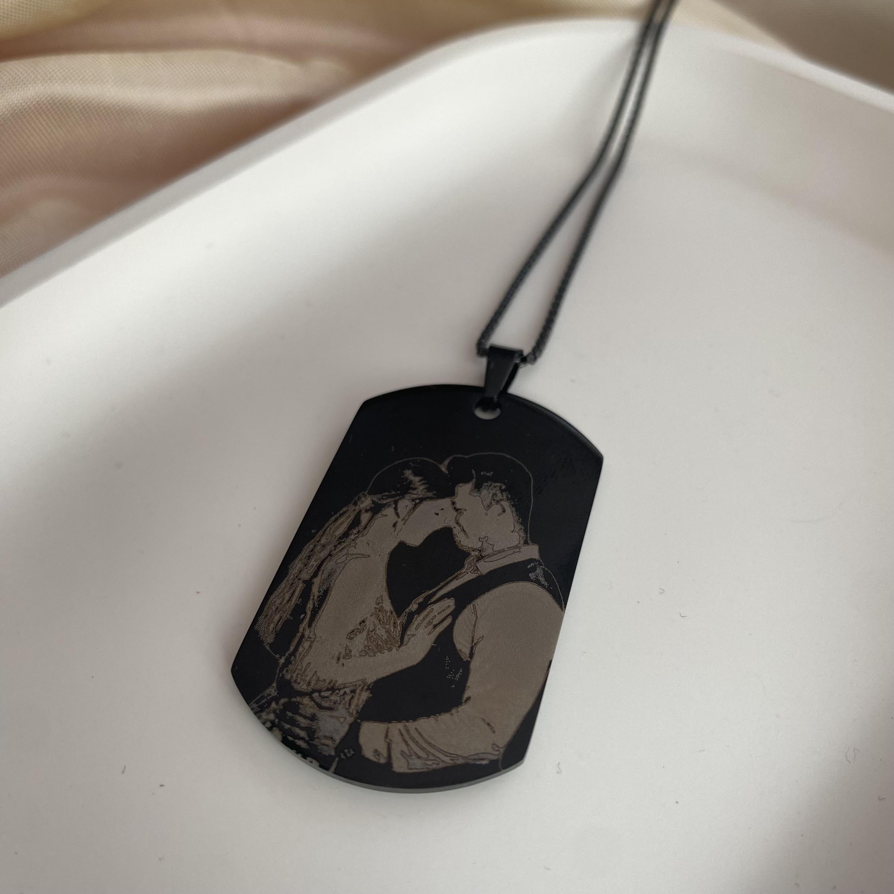 Kolye üzerine lazer baskı ile resim, isim, harf, tarih, yazı işlenir.