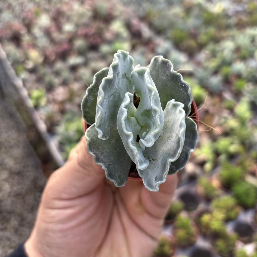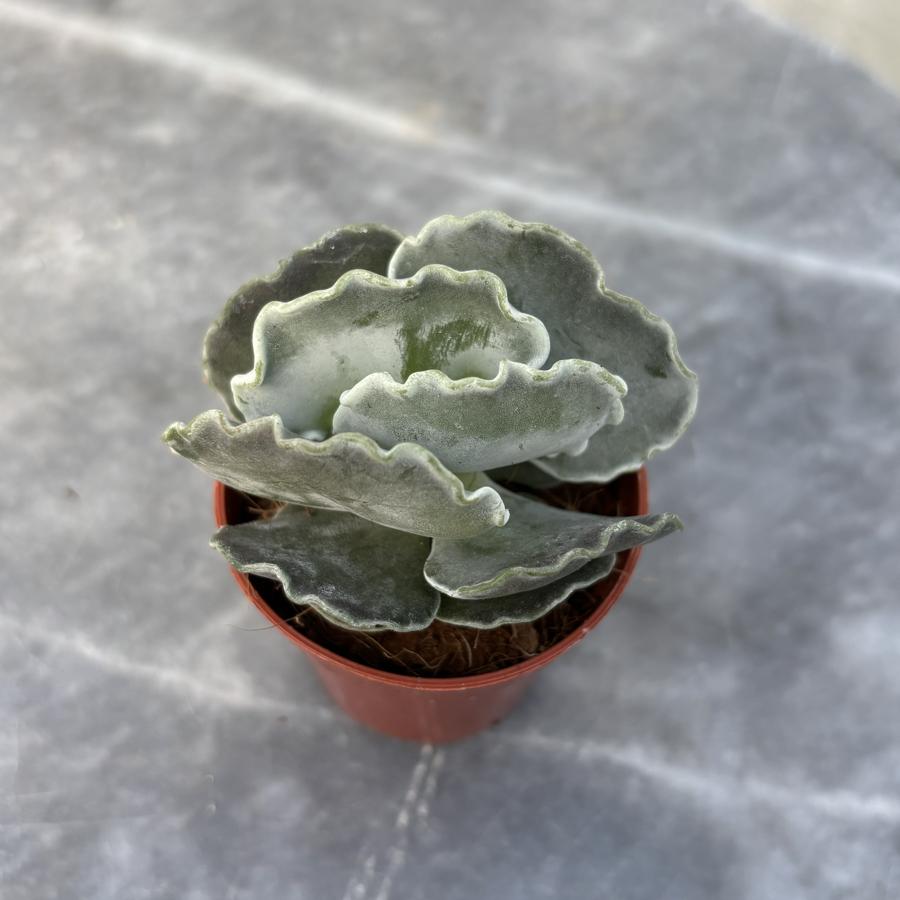 Dalgalı kenarlı, pudramsı gri yapraklarıyla minik ama karakterli bir sukulent! Raf, masa ve hediye alternatifi için çok tatlı bir seçim.