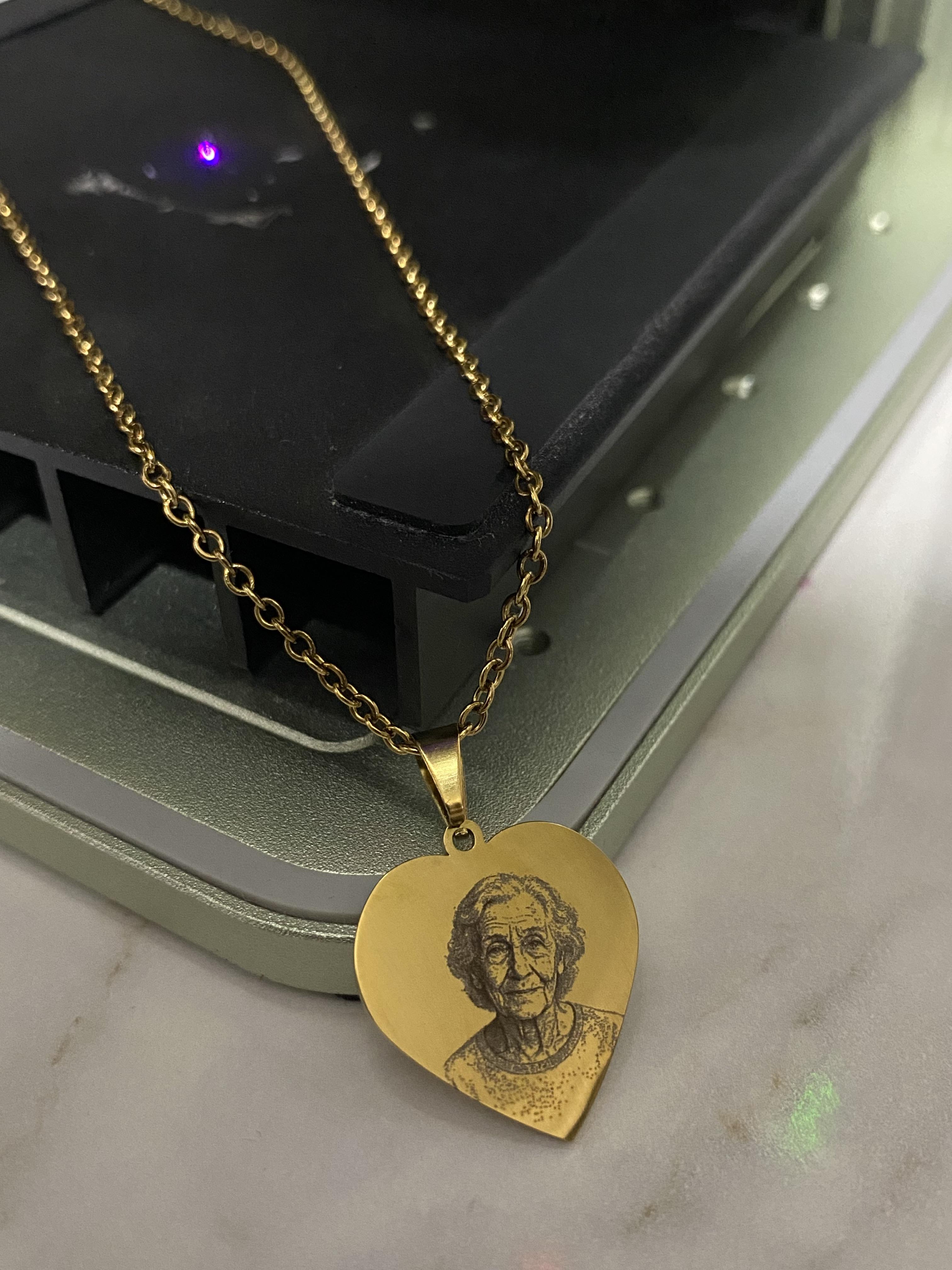 Kolye üzerine lazer baskı ile resim, isim, harf, tarih, yazı işlenir.